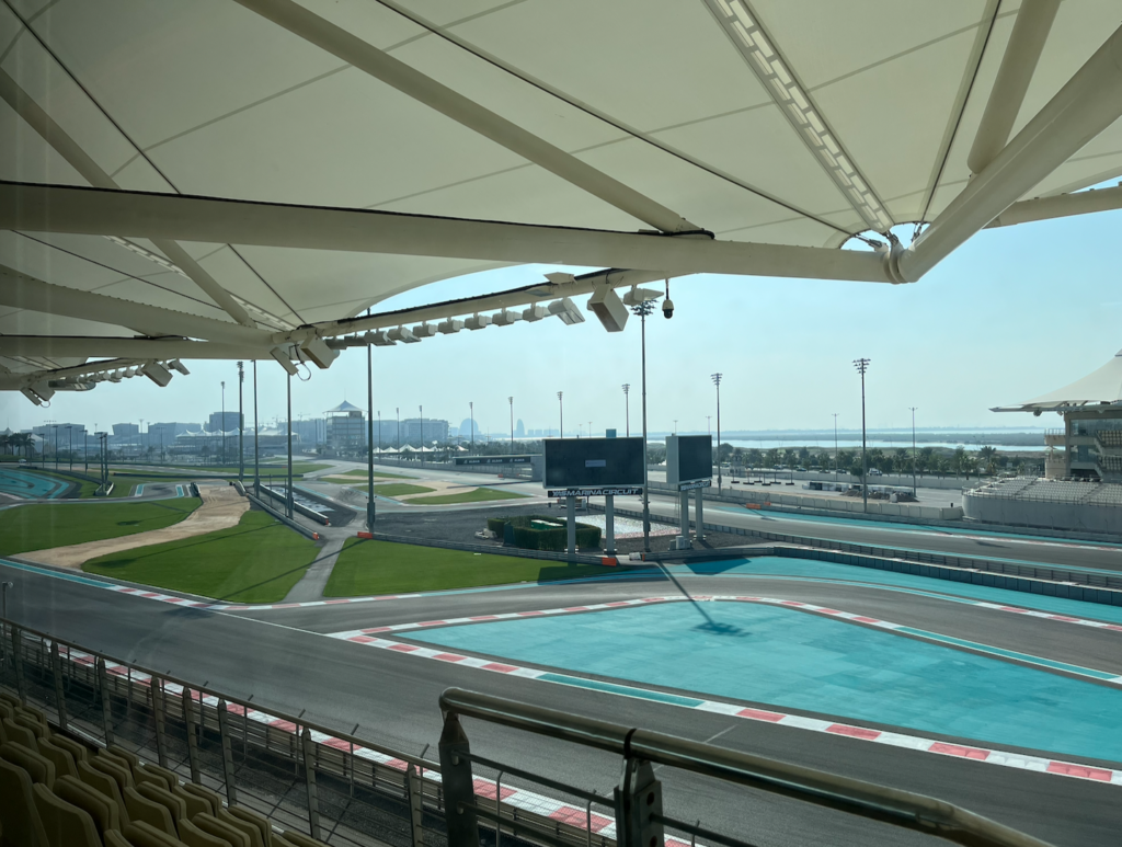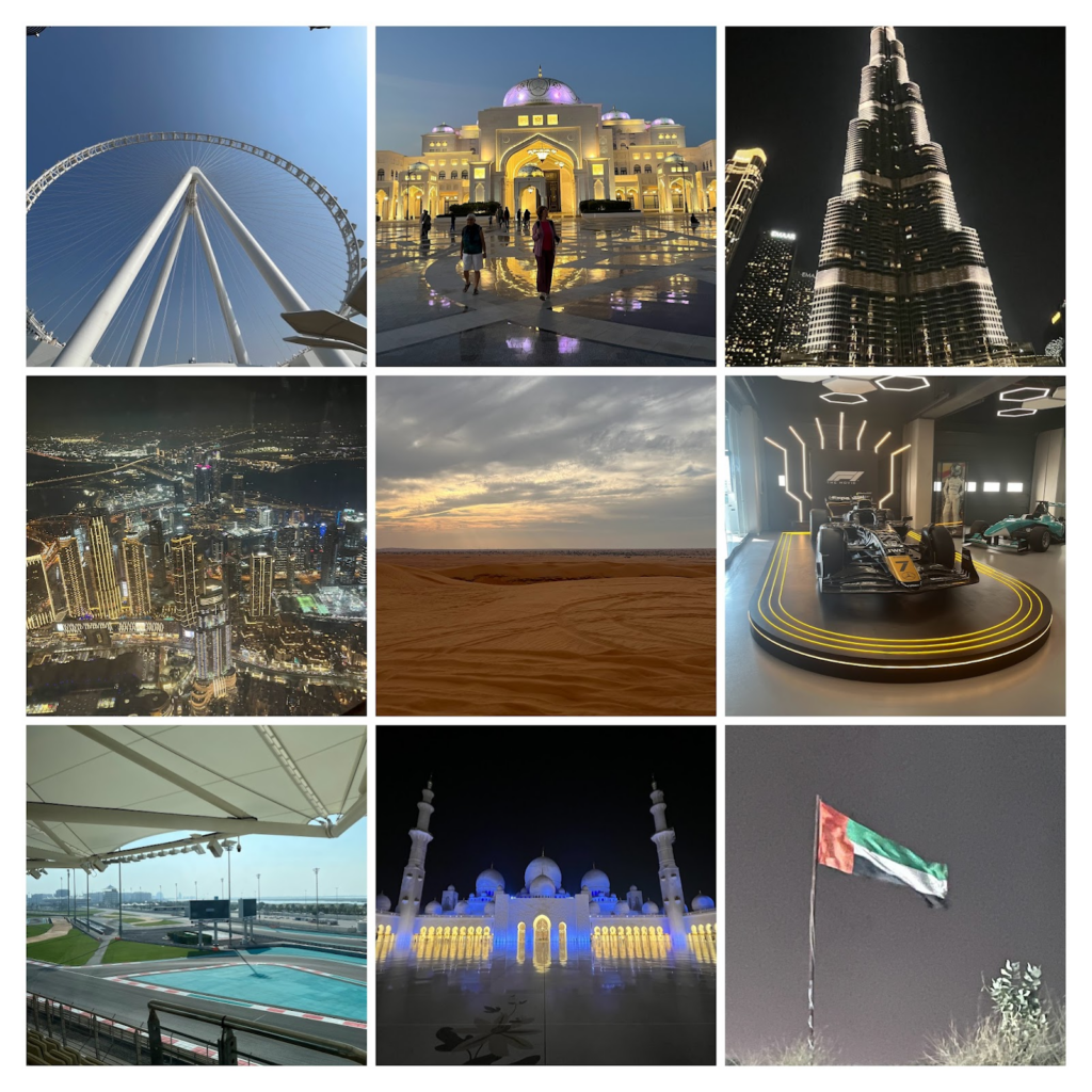 We started our day with about a two hour drive from Dubai to Abu Dhabi. We planned on going to the Yas Marina Circuit which is a Formula 1 racetrack and the Sheikh Zayed Grand Mosque. On the way to Abu Dhabi, we made a quick pit stop at a gas station to get food. There we had some Indian food like biryani, egg paratha, and some chicken 65. The food was actually a lot better than I expected it to be. We then continued our journey to the place we were staying for about 1hr. Once we got to our apartment, we realized the location was amazing. We were right next to the Abu Dhabi Airport, the F1 track, and Ferrari World which we would be going to the following day. We headed to the F1 track and once we arrived at the lobby, we immediately noticed the showroom which was full of F1 cars. The car in the F1 movie was in the showroom which was really cool. I realized that F1 cars are a lot longer than I thought they were. Our tour guide was really informative and while the tour was going on, a Formula 3 regional practice race was going on at the same time. We also got really close to the track and the cars would zoom past us. It was really loud but our tour guide said “If you think this is loud, wait til you see an F1 race.”. After the F1 track, we headed to the Sheikh Zayed Grand Mosque. If you don’t know, Sheikh Zayed bin Sultan Al Nahyan was the first leader of the United Arab Emirates (UAE) after the country’s creation in 1971. The mosque started being built from 1994 and finished in 2007 which is 3yrs after Sheikh Zayed sadly passed away. Sheikh Zayed opened the mosque to the public because he wanted to promote peace and to create a landmark for both Muslims and non-Muslims. The mosque was nothing short of amazing. The architecture was amazing and the azan which is the call to prayer sounded spectacular. The person singing had such an amazing voice and it was honestly soothing and calming. After the mosque, we headed to the Yas Mall and had dinner at a traditional Emirati restaurant called Al Fanar. Like Lebanese food there was lots of meat and hummus. Really good food but I preferred the Lebanese food we had a lot more. After a long day, we finally arrived at our apartment and called it a day.