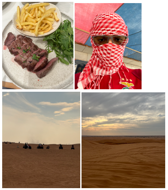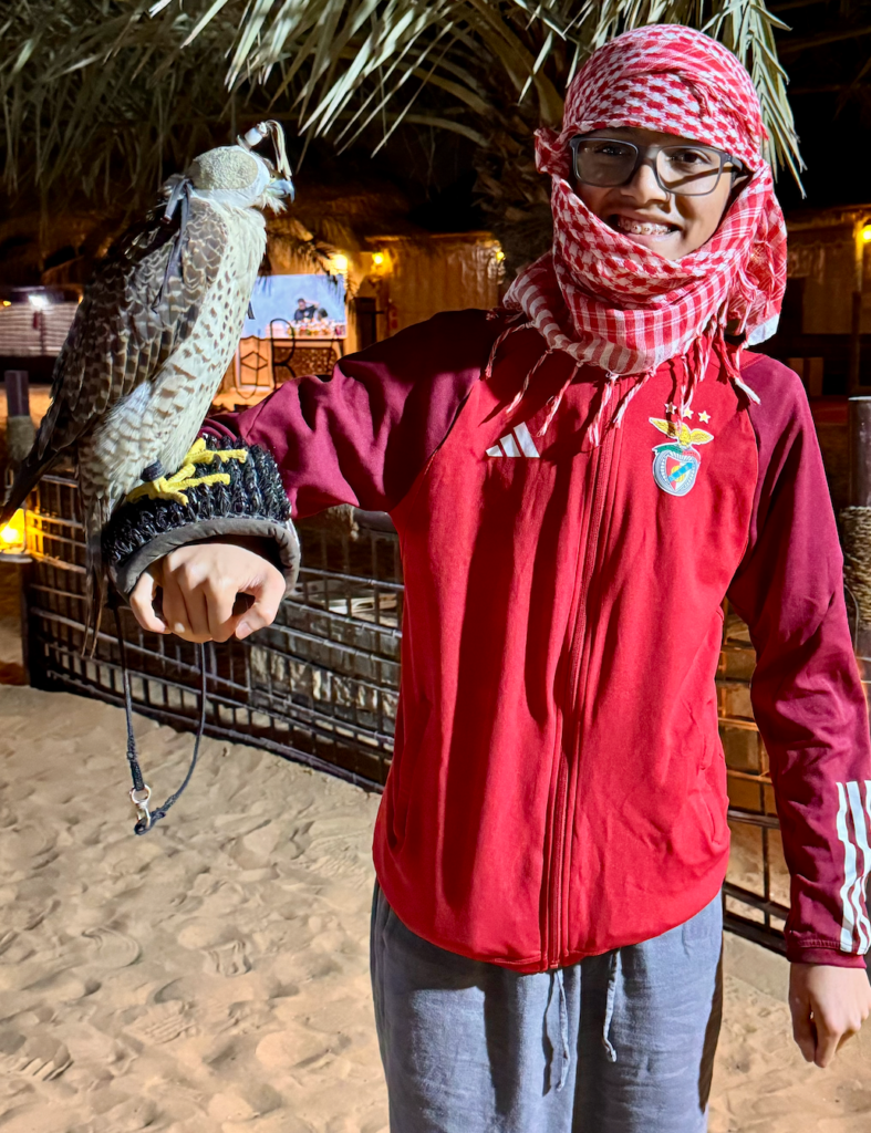 The morning was very slow and we didn’t do much. For lunch I had steak and fries which was mediocre. It was good but I’ve had better steaks. After lunch, we had a desert safari which was easily one of the best parts of the trip. We went on ATVs which were fun and thrilling. Before we went on the ATVs we were given the traditional Arab headscarves called Keffiyeh. I really enjoyed wearing them to the point that I’d be wearing it every single day. The only downside of the ATV driving was that it was a fenced space but other than that it was amazing. We later started to go into the desert and I noticed that in some parts the sand was redder than other parts. This is the case because some parts of the desert have more iron compared to others which makes the sand red. Right before we entered the desert, we took a quick stop to deflate our tires to have better traction in the sand. In the desert, we went up and down on dunes which was a lot more fun than going on a rollercoaster in my opinion. If you experience motion sickness I would highly recommend taking your medication before you go. As we got out of the desert, we made a pitstop at a plaza with some shops to inflate the tires. There I had some really refreshing coconut water which made me feel a lot better from the slight motion sickness during the bumpy desert drive. Next we went to a camp in the middle of the desert. There it had traditional Emirati barbecue and some other food. There were performances such as belly dancing and tricks with fire. I even got a picture with a falcon. Given that it was a weekend, there was lots of traffic on our way back to our apartment. We came home at around 9:30pm feeling very tired yet very satisfied with the fantastic day that we had.