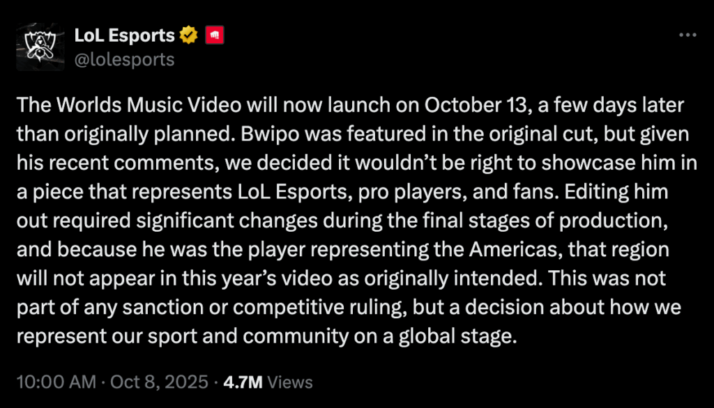 Bwipo’s public statement led to his punishment for the next series in the LTA Finals playoffs. The money that he would have earned was donated to organizations that supported women in gaming. Bwipo has made around $458,878.32 throughout his esports career. This punishment would barely impact him, and users online have claimed that this punishment was not severe. As a result, this incident would likely fuel toxicity among players, given the low punishment and lack of official action from Riot Games. Bwipo eventually responded to the backlash and apologized, but this event had a lasting impact on his future in esports. On the other hand, Riot Games officially responded to Bwipo’s comment on October 8, 2025. They stated that when making the World’s Music Video, “Bwipo was featured in the original cut, but given his recent comments, we decided it wouldn’t be right to showcase him in a piece that represents LoL Esports, pro players, and fans.” The World’s Music Video is used to highlight important players of the League of Legends Esports and their contributions to this field. Bwipo’s removal demonstrates how his behavior is unwelcome and is not how Riot Games would want their esports community to be represented. While it is a small step toward removing toxicity among players, it has a large impact, and this action will set the tone for future esports environments.